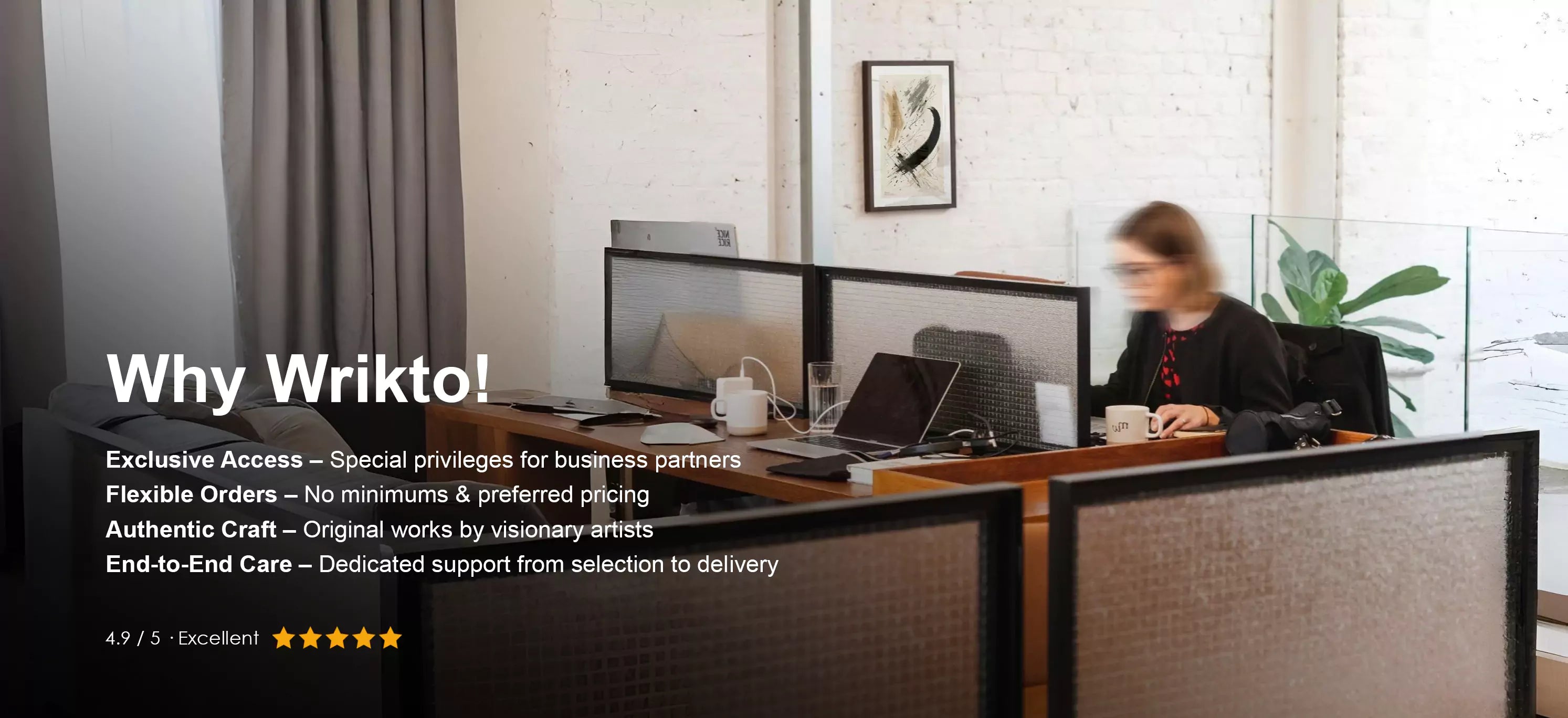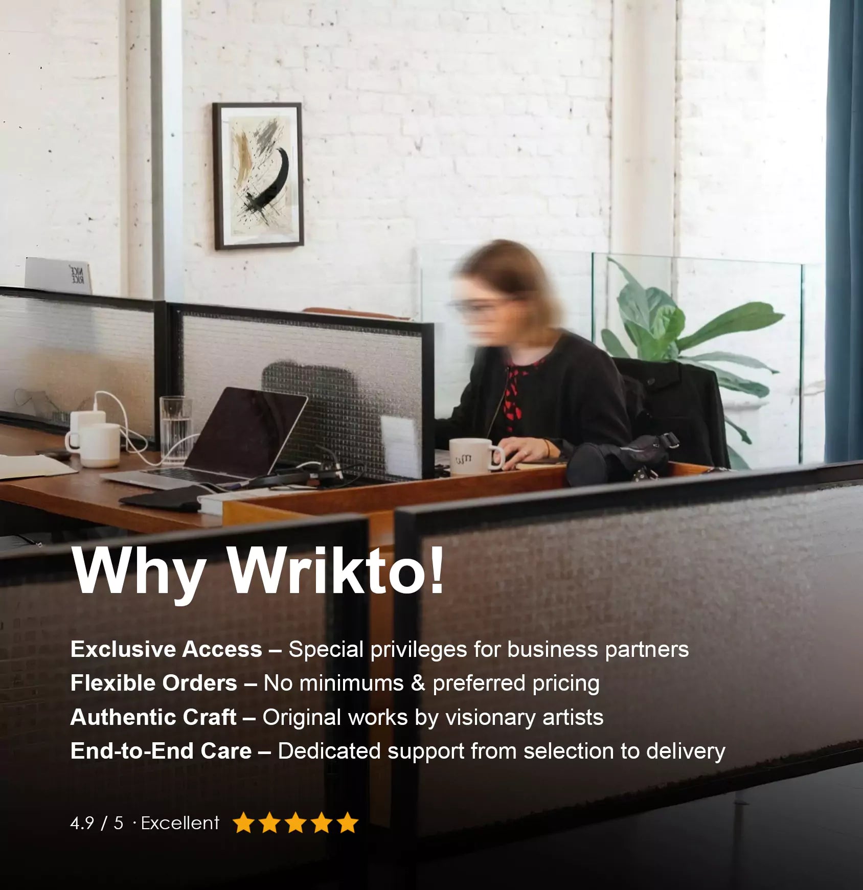 At Wrikto, art is more than what hangs on a wall — it’s an atmosphere, a statement, a story. Beyond homes, we collaborate with businesses, designers, and professionals to create visionary workspaces, hospitality, and retail environments. Our Business Program offers preferred access, tailored support, and exclusive benefits for projects of every scale.